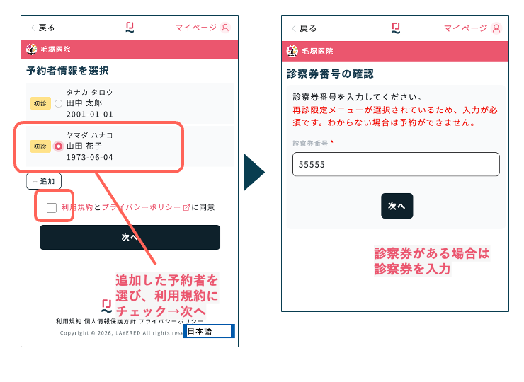 ※診察券がない家族の場合は診察券番号の入力はスキップして構いません。
