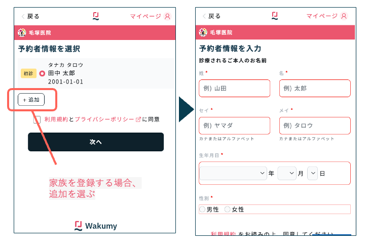 - 予約者選択画面から追加ボタンを押して、家族の情報を登録する
