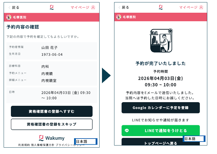 1つのWakumyアカウントで、子供など家族の分の予約も取得できます。