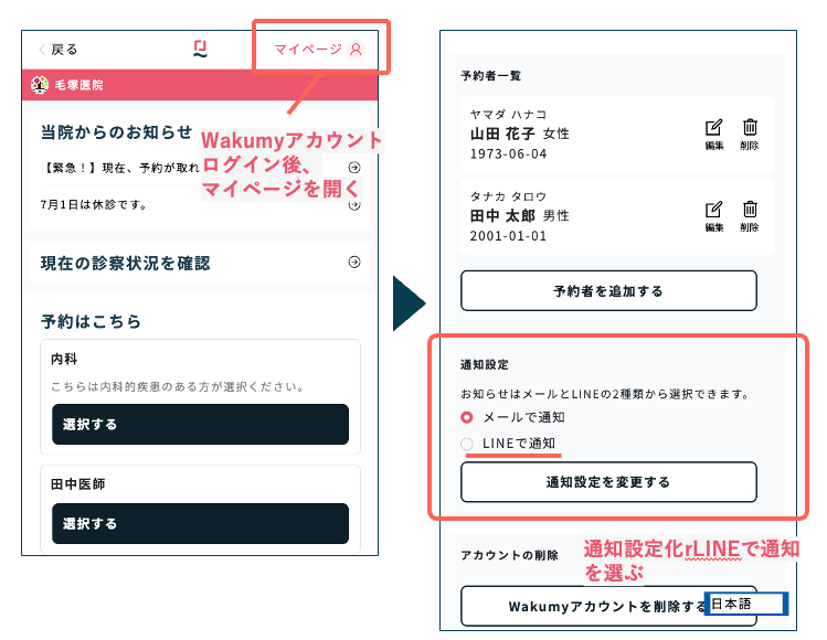 Wakumyでは、予約完了や、診察順番が近づいたなどの通知をメールではなくLINEで受け取ることができます。
