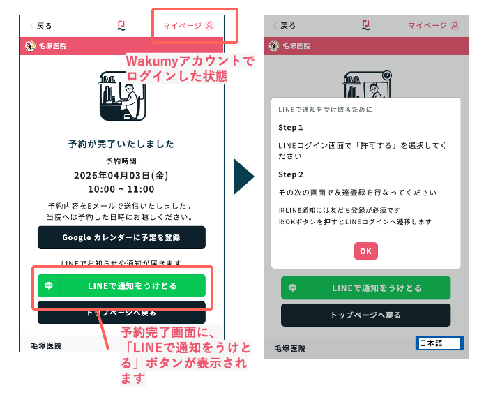 ※LINE通知はWakumy利用医療機関によって利用できるできないが異なります。医療機関によってはLINE通知をご利用できない場合がございますので、ご了承ください。