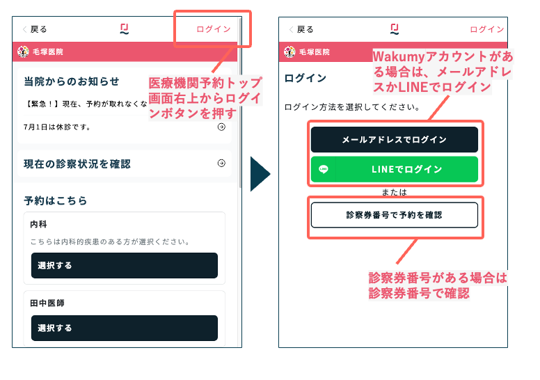 医療機関トップ画面右上のログインから、Wakumyアカウントを作成した方法(メールアドレス、もしくはLINE認証)でログインください。