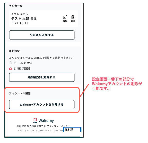 - Wakumyアカウントを削除すると、アカウントの復活はできませんのでご了承ください。